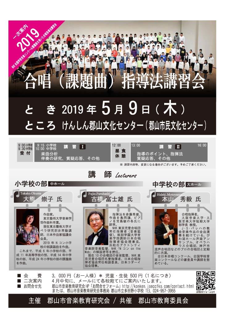一次案内 二次案内 2019年度 合唱(課題曲)講習会 ※ 講習内容及び当日の日程については、変更する場合があります。予めご了承ください。 ※ 二次案内(最終)は4月中旬にご案内いたします。 2019年度 合唱(課題曲)講習会 2019合唱(課題曲)指導法講習会二次(最終)ご案内 ダウンロードお申し込みは、ご案内により申込書をFAX送付ください。 ※ お問合せは、ここからお願いいたします。